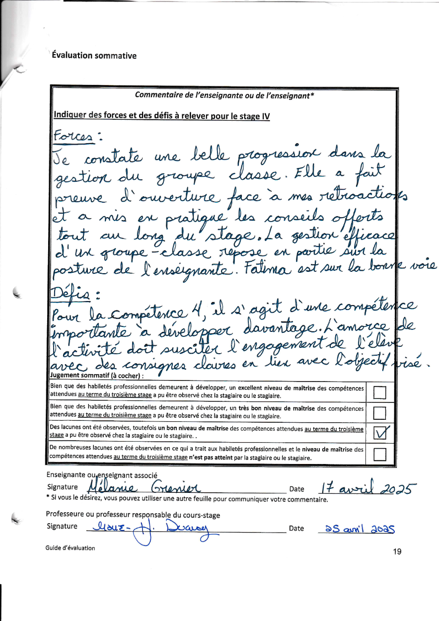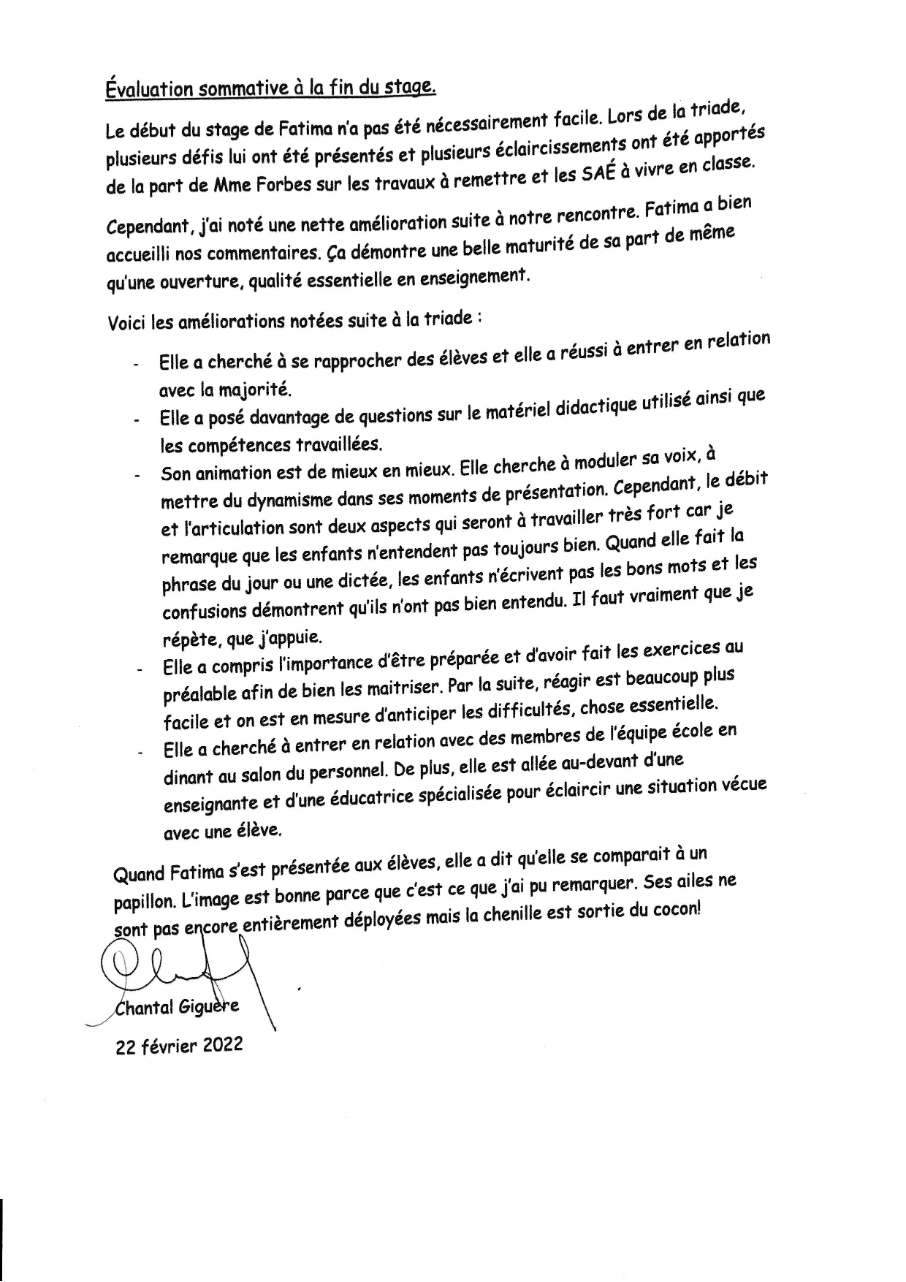 Cette expérience m'a montré à persévérer et à agir en tant que professionnelle. J'ai réussi mon stage, mais mon enseignante associée n'avait plus le droit de m'évaluer, n'étant plus objective. C'est l'université et la direction qui m'ont évalué. J'ai eu plus de moments de supervision que prévu pour un stage 2. Je n'omets pas de le mettre, car il fait partie de mon parcours. Cependant, par souci de confidentialité je ne mentionnerais pas son nom. Cette expérience fut éprouvante tant psychologiquement que physiquement.
